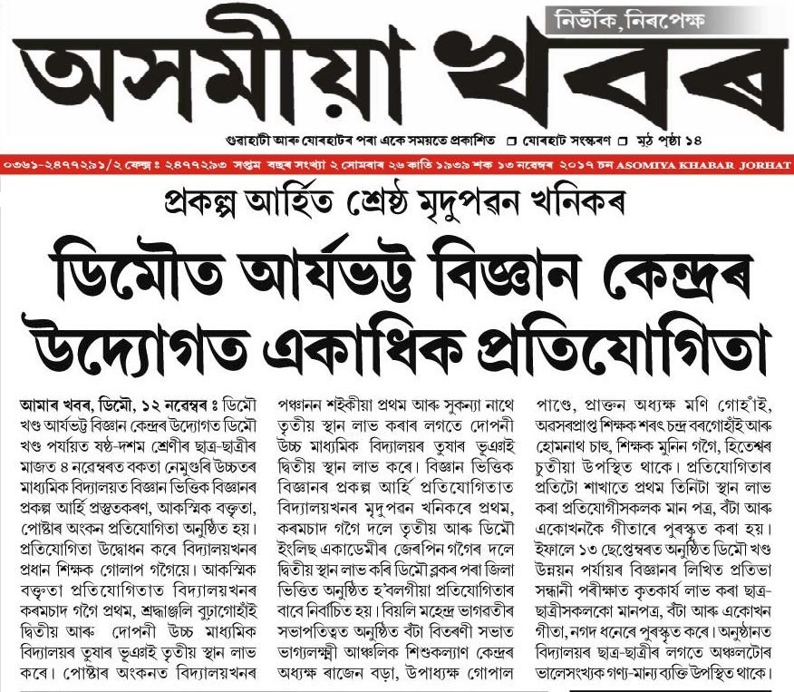 Conducting Demow Block Aryabhatta Science Centre Under ASTEC under Ministry of Sc. and Tech. Govt. of Assam.